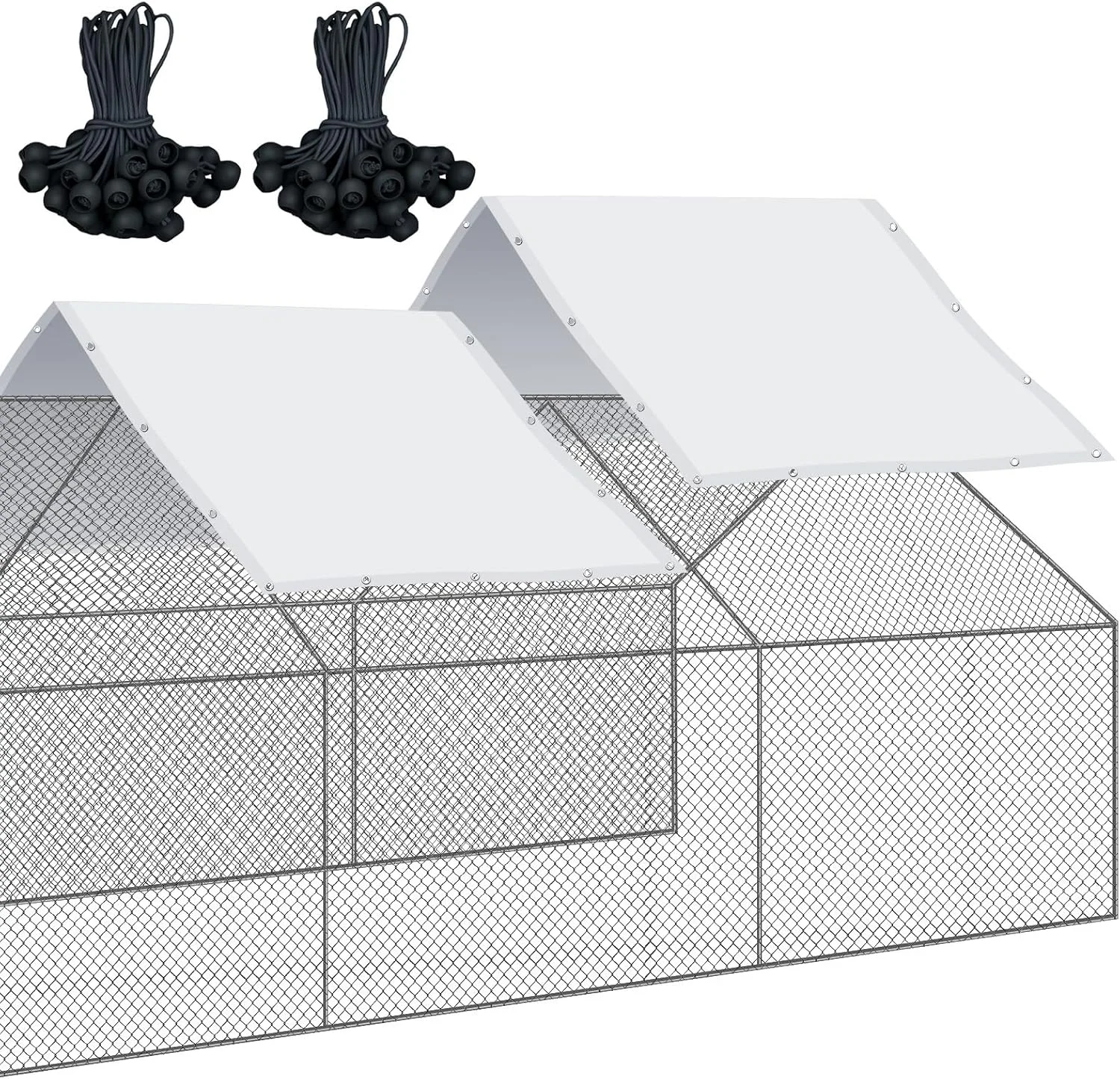 2 x Chicken Coop Covers, 70 x Ball Bungees Cords, 1 x Metal Frame, 6 x Netting